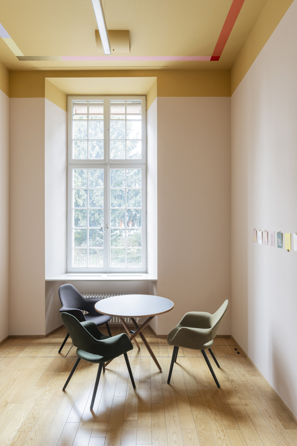 Die dunklere farbige Decke greift über ihren Perimeter hinaus in die bunte, aber hellere Wand. Darauf zieren Farbstreifen in den Hausfarben die Akustikdecke und zeichnen den Reichtum originaler Stuckaturen auf eine moderne Art nach. Spielerisch soll mit dem konfettiartigen Farbspektrum der CIs dem Detailreichtum des Stucks nachgeeifert werden und in einen spannungsvollen Dialog treten. Eine kreative Atmosphäre im Dialog mit Zeit und Raum.